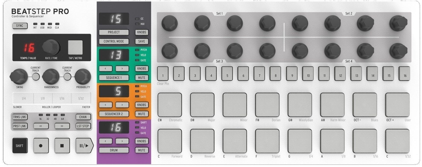 Контролер надає прямий доступ до 16 проектів, кожен з яких складається з 16 патернів для кожного з секвенсерів. Кожна секвенція може містити до 64 кроків з індивідуальною артикуляцією pitch, velocity та gate для кожної ноти. Ударний секвенсер має 16 окремих доріжок на секвенцію (по одній на пад). BeatStep Pro пропонує робочий процес, до якого ми звикли з класичних ударних машин, тобто ми можемо записувати звуки на пад, або використовувати їх як вмикачі on/off для треків. BeatStep Pro поєднує в собі найунікальніші та найпопулярніші ефекти: лупер з сенсорною стрічкою, рандомайзер та свінг.