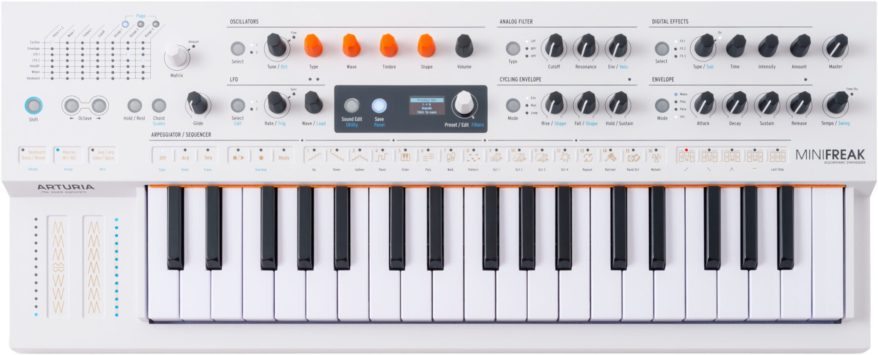 Незважаючи на пристрасть до дикого та експериментального дизайну звуку, MiniFreak є інструментом вираження. Його 37-клавішна клавіатура, чутлива до швидкості з aftertouch, та спонтанна функціональність Seq/Arp роблять гру на ньому мрією, тоді як функції рандомізації ставлять на перше місце розваги.