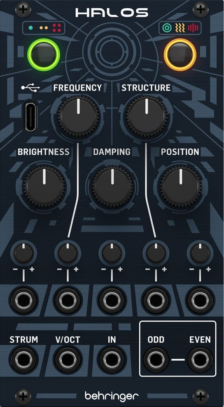Налаштуйте точно тон, який ви хочете, завдяки інтуїтивно зрозумілим елементам управління: встановіть висоту звуку за допомогою функції Frequency, змініть властивості матеріалу за допомогою функції Structure та налаштуйте відлуння за допомогою Damping. Позиція та яскравість додають експресивних нюансів, а повний контроль CV робить HALOS таким динамічним, як вимагає ваша патч.