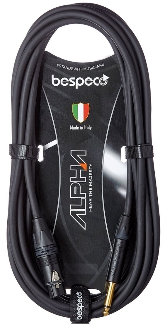 Мікрофонний кабель. Несиметричний екранований кабель серії Alpha, виготовлений з одного моно з’єднувача Neutrik 6,3 мм та одного жіночого з’єднувача Neutrik XLR. Завдяки неймовірній якості звуку серія Alpha компанії Bespeco рекомендується в кожній ситуації, що вимагає максимальної вірності передачі сигналу, як в діапазоні частот, так і амплітуди сигналу.
