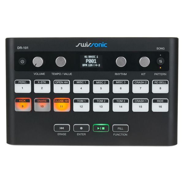 Swissonic DR-101 — це потужна і доступна драм машина, створена для тих, хто шукає високоякісну, але недорогу альтернативу для створення ритмів у студії або на сцені. Вона орієнтована на музикантів, продюсерів і живі виступи, що хочуть отримати класичний аналоговий звук барабанних інструментів, при цьому маючи простоту у використанні та гнучкість у налаштуваннях.