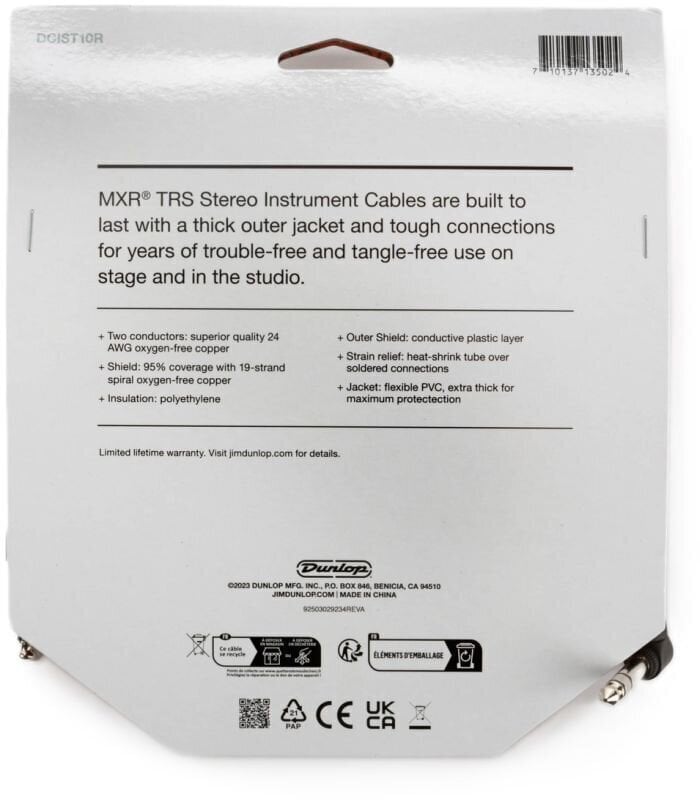Гарантія від виробника: Dunlop Manufacturing, Inc. гарантує первинному власнику кабелі марки MXR на весь період використання продукту. Ця обмежена гарантія покриває лише дефекти матеріалів або виготовлення і не поширюється на травми користувача, випадкові або побічні збитки, а також витрати.