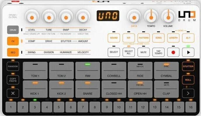 UNO Drum — це простий у програмуванні, портативний модуль ударних з відмінною якістю звуку. Він пропонує комбінацію чисто аналогових (бочка, малий барабан, клацання, хай-хет) та цифрових (том, рім, ковбел, райд, краш-цимбали) ударних звуків, створюючи складні та унікальні ударні партії.