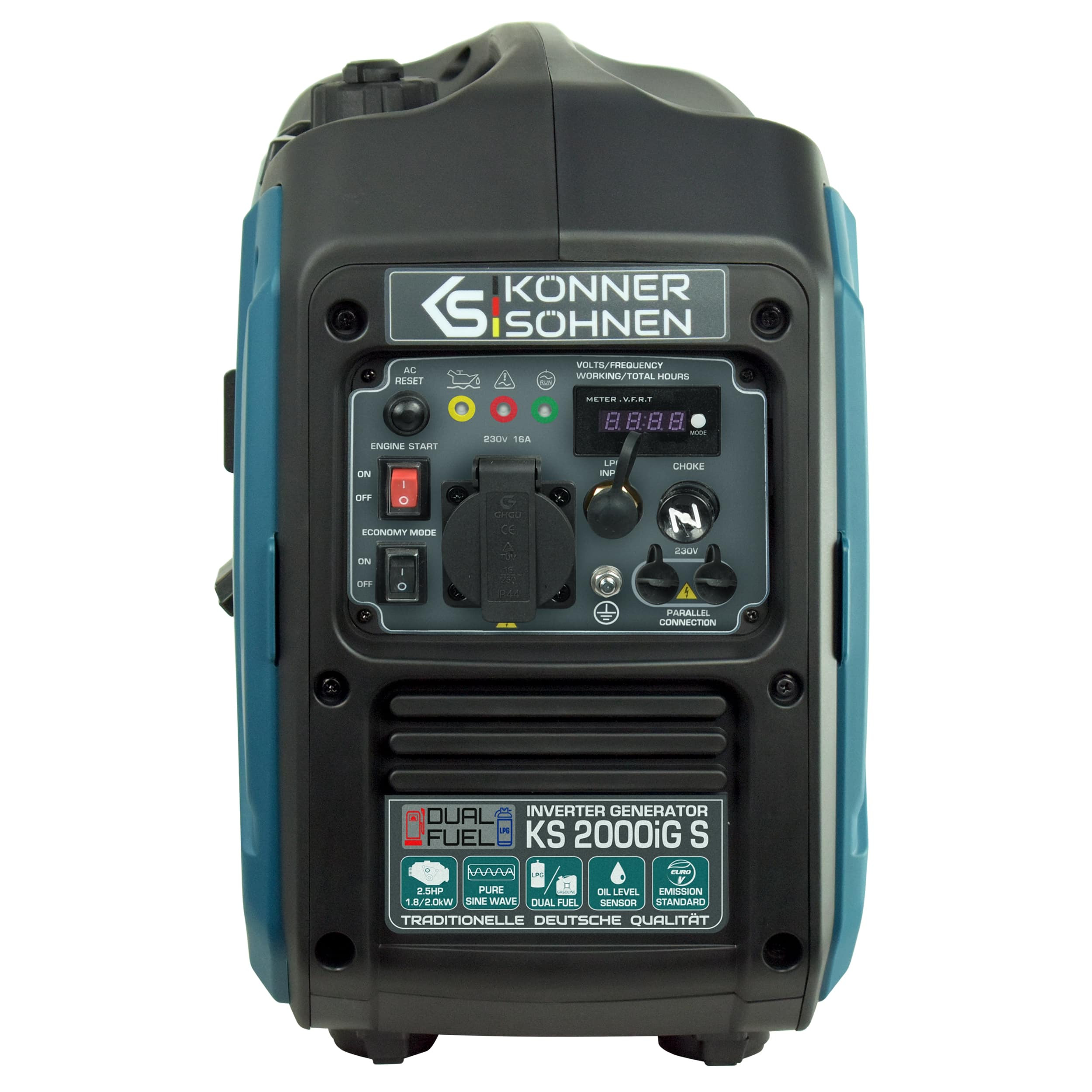 Газобензиновий генератор інверторного типу KS 2000iG S німецької торгової марки Könner&Söhnen в шумозахисному корпусі – це зручне та компактне джерело електроенергії з низьким рівнем шуму. Ключова особливість даної моделі полягає в тому, що вона виробляє електричний струм з правильною синусоїдою.