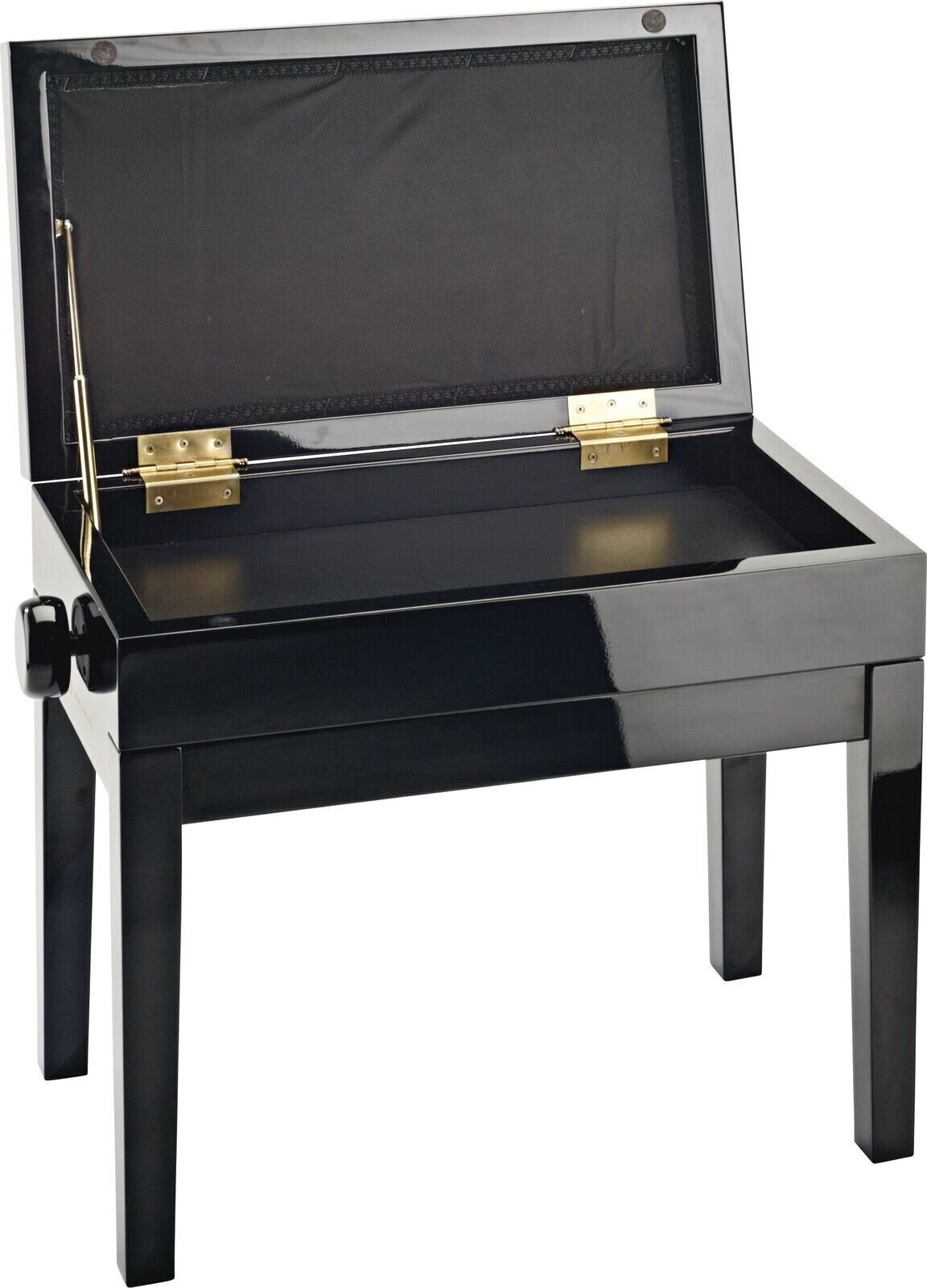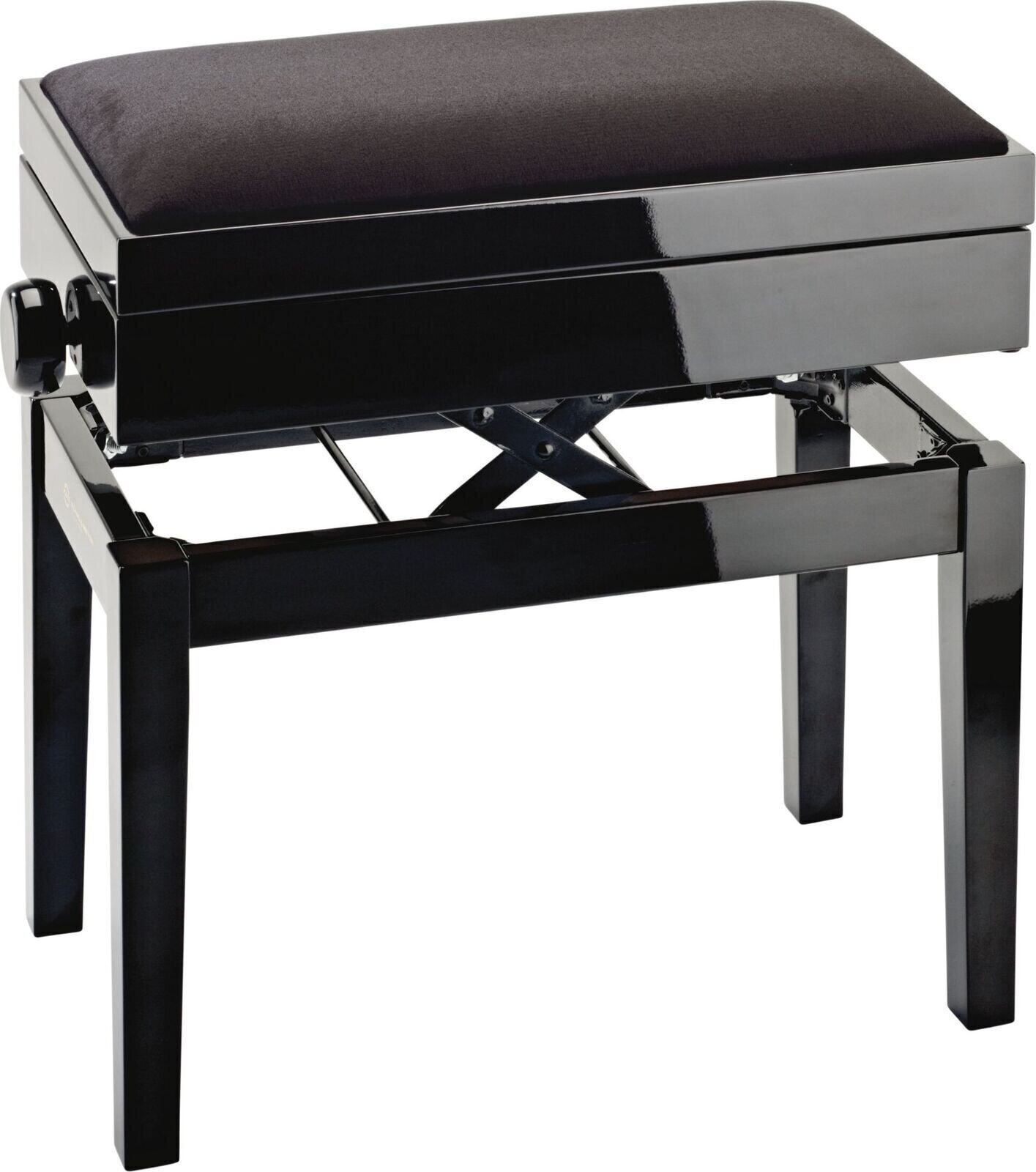 Комплектна лавка для піаніно з подушкою на сидіння та інтегрованим сховищем для нот. Виготовлена з міцного європейського букового дерева, лакованого чотирма шарами поліестеру. Стійкі ніжки з антиковзними гумовими заглушками. Подвійний поперечний механізм для легкого та точного регулювання висоти. Витривала подушка на сидіння виготовлена з матеріалу MDF з чорним оксамитовим покриттям. Лавка для піаніно постачається в розібраному вигляді та легко монтується.