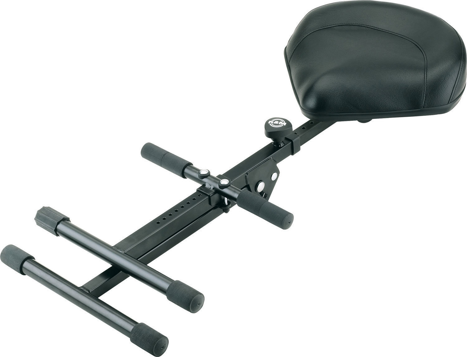 Універсальний сталевий стілець з ергономічно сформованим сидінням (380 x 350 мм) з покриттям, що імітує шкіру, та двочастинною складною конструкцією стійки, яка забезпечує належну підтримку та знижує навантаження на спину, запобігаючи передчасному втомленню. Сидіння можна регулювати під будь-яким кутом, а висоту можна налаштувати за допомогою пружинного фіксуючого колеса в діапазоні від 600 до 900 мм. Висота практичної та вигідної підставки для ніг також регулюється. Міцна конструкція ніжок та інтегровані регульовані наконечники забезпечують стабільність та безпеку стільця на нерівних поверхнях. Стілець можна скласти в плоску форму для транспортування. Вага: 6,22 кг. Колір чорний.