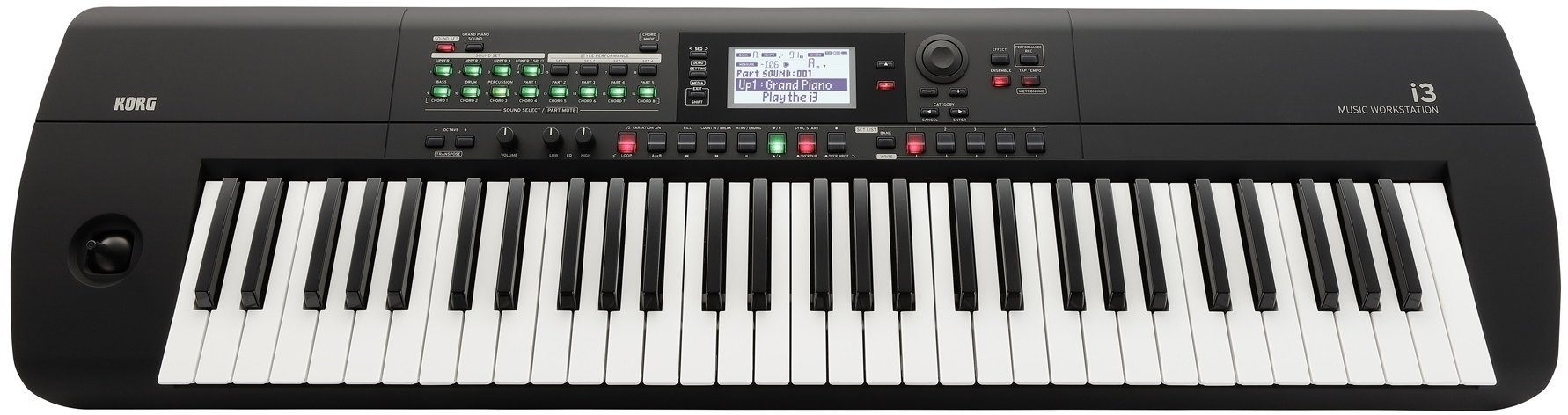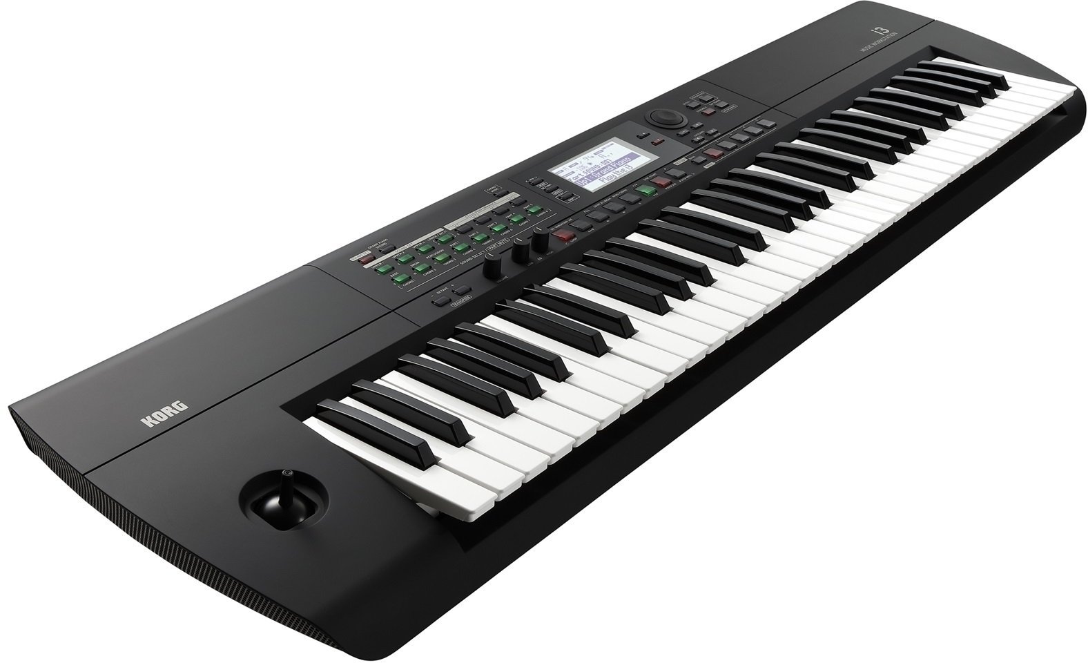 61-клавішна робоча станція Korg. KORG i3 — це повнофункціональна робоча станція з 61 повнорозмірними клавішами, що реагують на динаміку. Реакція клавіатури регулюється за допомогою трьох кривих дотиків; четверте налаштування забезпечує постійний рівень виходу. Кнопки OCTAVE змінюють висоту клавіатури вгору або вниз на дві октави, у октавних приростах. Професійний джойстик дозволяє артикуляцію pitch bend, vibrato та blask в реальному часі; додатковий двосмуговий еквалайзер (низький і високий) забезпечує остаточну регуляцію загального тону.