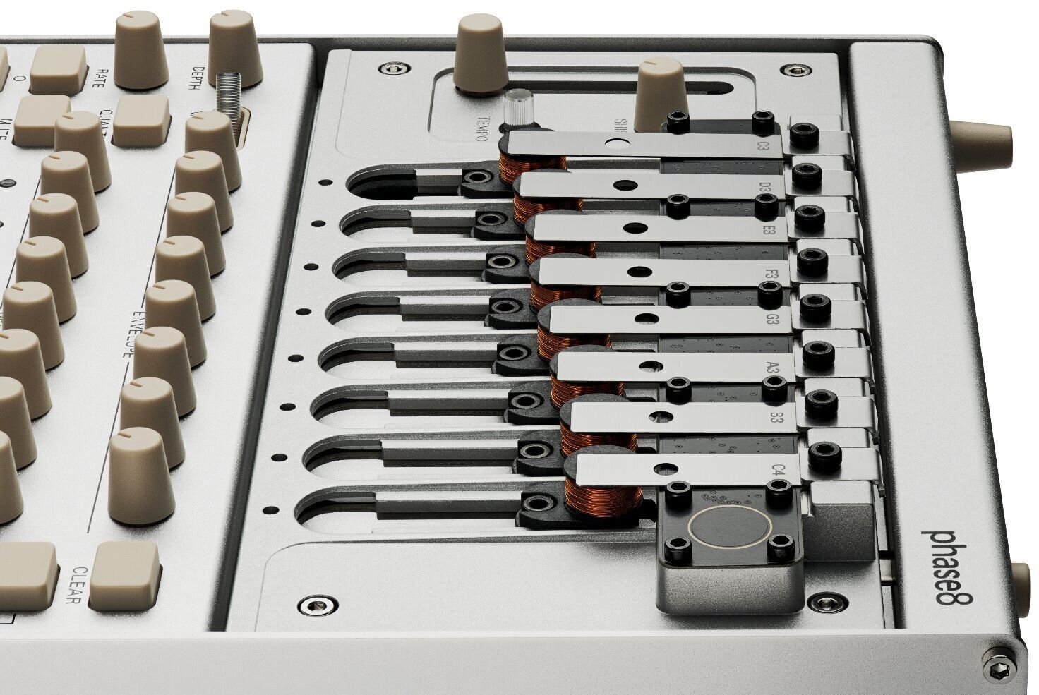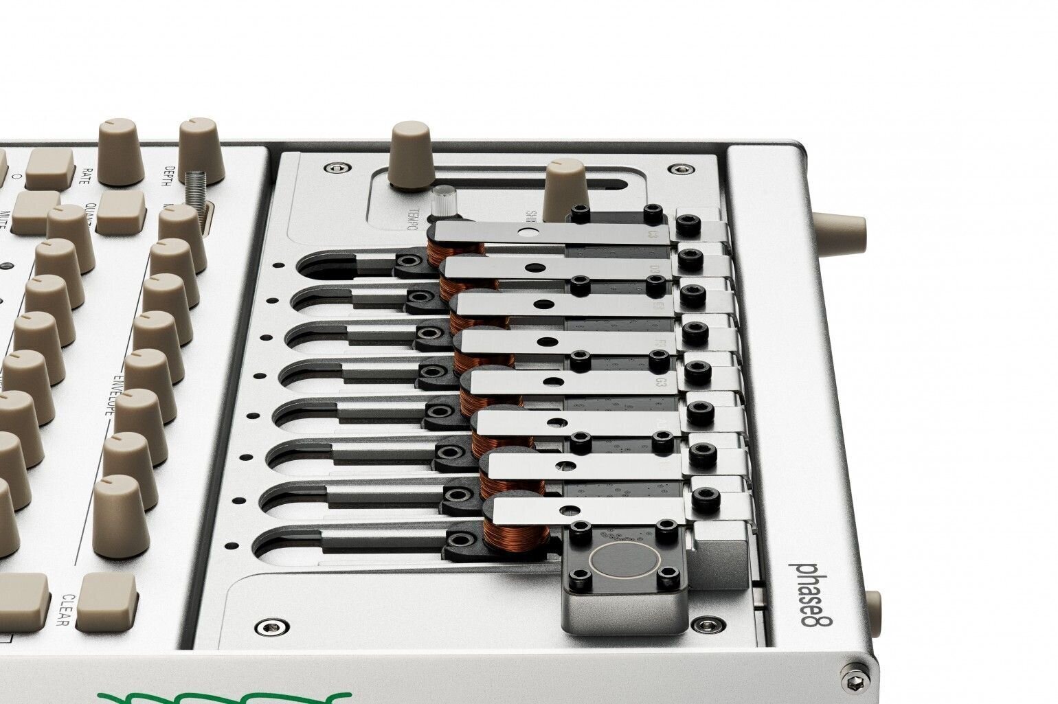 phase8 оснащений 13 хроматично налаштованими резонаторами; 8 з них можуть бути встановлені в будь-який момент. Завдяки контролю обвідної, ці резонатори можуть виробляти все, від коротких перкусійних звуків до довгих, простягнутих звуків. Конструкція дозволяє легку заміну та налаштування резонаторів, що дозволяє адаптувати масштаб і характер phase8.