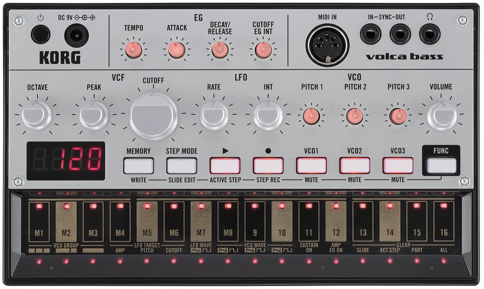 Analogowa maszyna basowa. Brzmіння потужних аналогових басів та секвенсер в стилі Electribea доступні в одному пристрої. Три аналогові осцилятори забезпечують насичені та величезні лінії басів. Пристрій має ново спроектований аналоговий фільтр, що забезпечує різке та чітке звучання, просту структуру з одиничними VCF, VCA, LFO та EG, 16-кроковий секвенсер з вісьмома комірками пам’яті, функцію Slide, яка є необхідною в Acid та інших жанрах електронної музики, а також Active Step, що генерує нові лінії басу шляхом видалення або вставлення наступних кроків. Self-tuning забезпечує постійний, стабільний строй, а Sync In та Out дозволяють синхронізувати годинник з багатьма інструментами серії Volca, а також з KORG Monotribe. Компактний розмір, живлення від батарей та вбудований динамік забезпечують можливість гри в будь-яких умовах. Агресивні звуки, які можуть гармонійно поєднуватися з перкусією; насичені звуки, що підтримують ритм; funky звуки, що генерують Groove – Volca Bass є аналоговим groove box’ом, який має все необхідне для створення широкого спектру ліній басів.