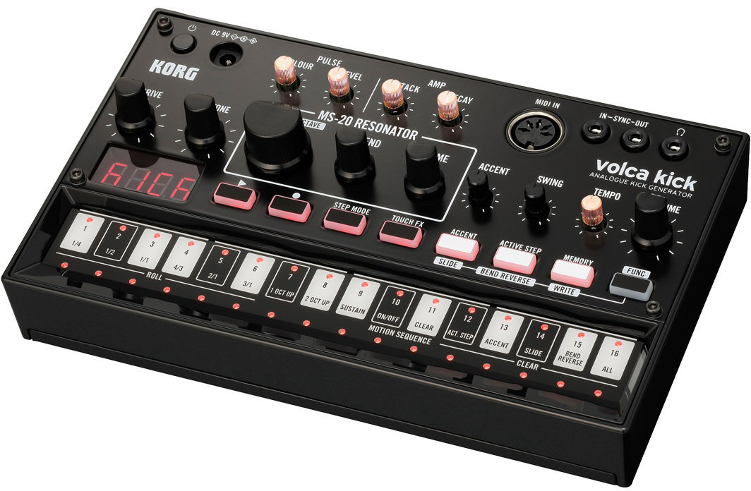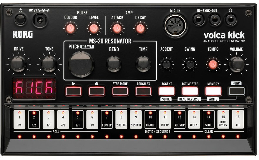 Korg Volca Kick має 16-кроковий секвенсер та нову функцію Touch FX, яка дозволяє зручно контролювати ефекти. Пристрій також оснащений: