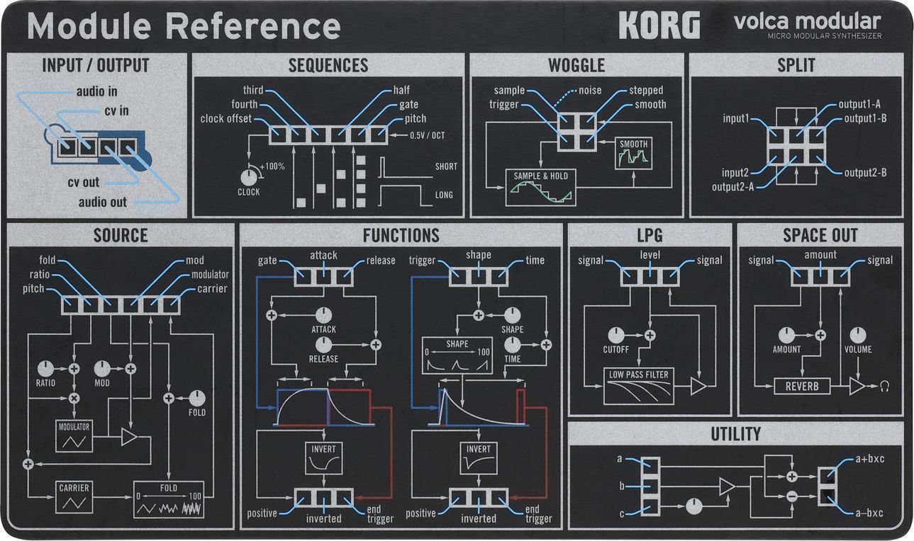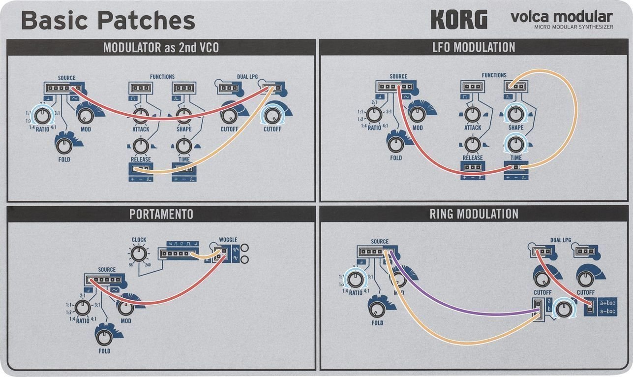 Кожен з модулів був ретельно обраний для забезпечення повноти. Модулі внутрішньо з’єднані, тому звук може бути створений навіть перед підключенням кабелів. Трасування показано білими лініями на панелі. З’єднання модуля за допомогою кабелю має пріоритет над внутрішніми з’єднаннями.