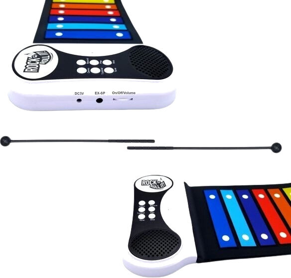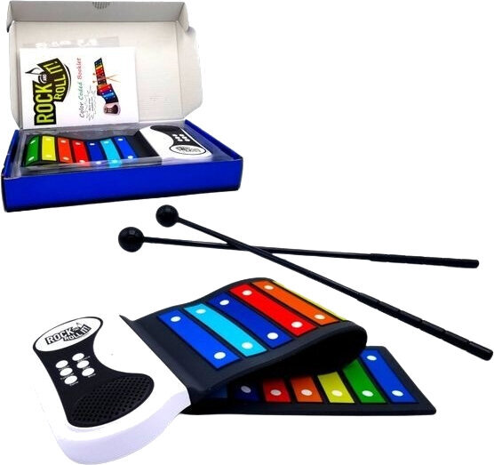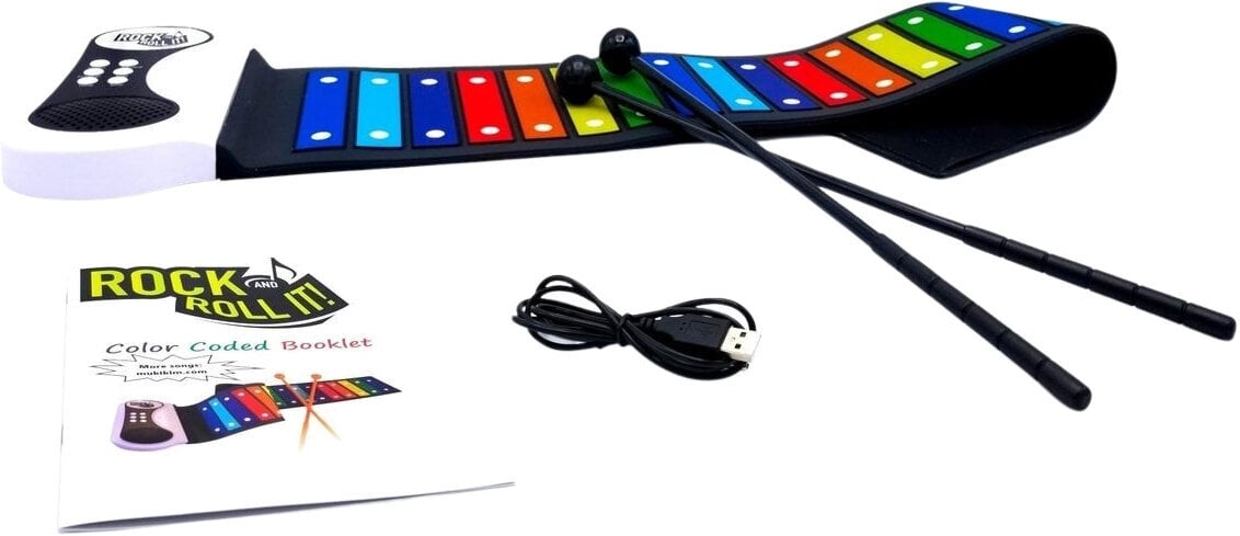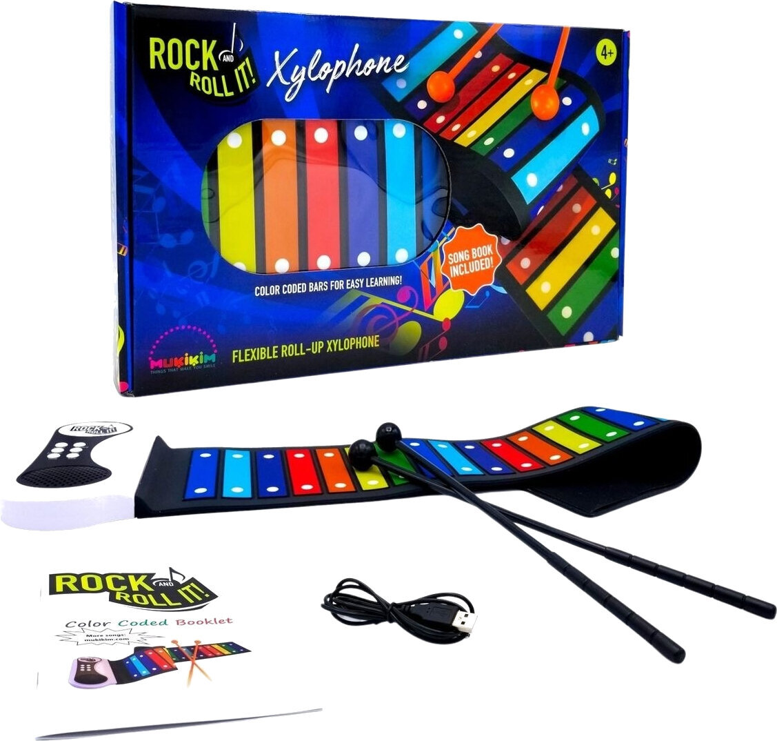 Електронний ксилофон з серії MukikiM Rock and Roll It. Rainbow Xylophone – це електронна ударна платформа, яка є гнучкою, портативною та легкою в подорожах. Стрічки та брошура з кольорами, позначеними кольорами веселки, дозволяють легко навчатися та відтворювати мелодії!