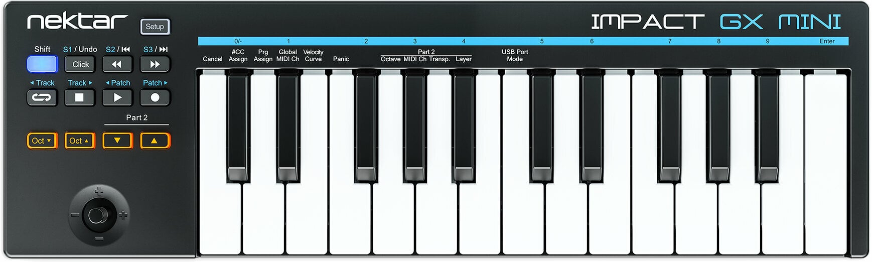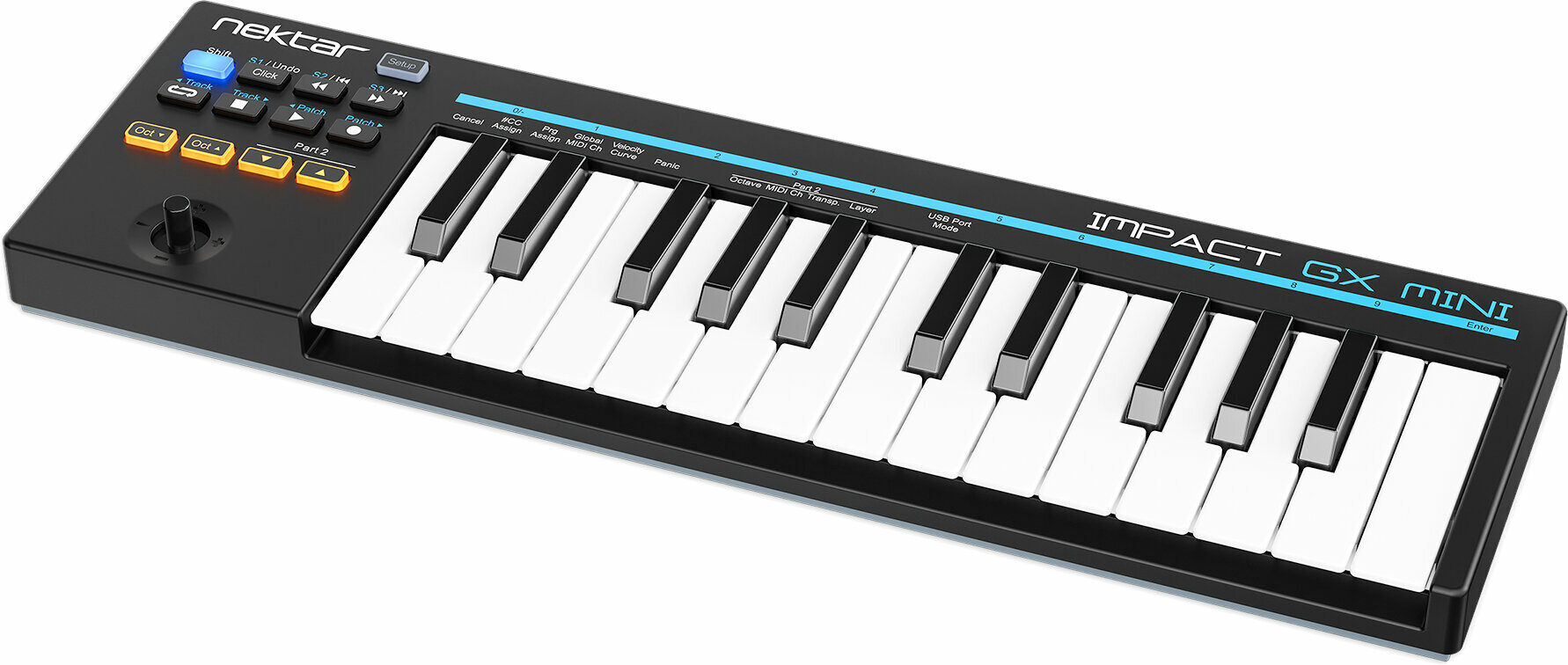 Impact GX Mini вміщує у вашому рюкзаку потужність визнаної серії USB MIDI контролерів Nektar Impact GX: 25 міні-клавіш з чутливістю до швидкості, джойстик для управління модуляцією, а також інтеграція Nektar DAW з найпопулярнішими програмами DAW. Унікальна функція частини 2 додає миттєву транспозицію, накладання шарів і не тільки. Impact GX Mini допомагає зафіксувати ваші ідеї, незалежно від того, де з’являється натхнення!