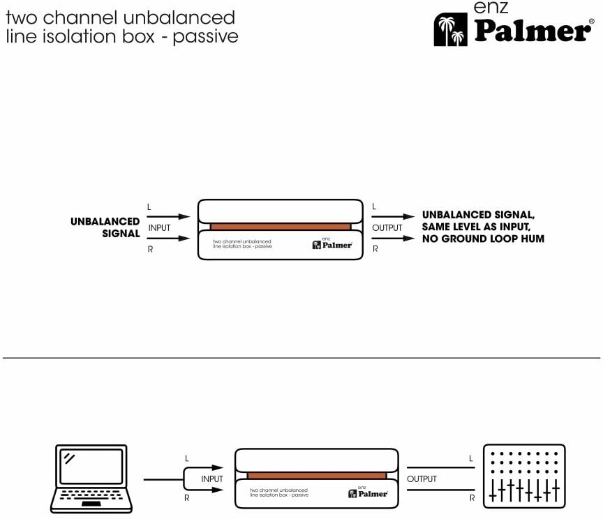 При підключенні мультимедійного програвача або ноутбука до системи HiFi або PA часто можна зіткнутися з шумами, такими як гудіння, викликане петлями заземлення. З Palmer Enz ви можете бути впевнені, що такі дратівливі сигнали заважати більше не будуть!