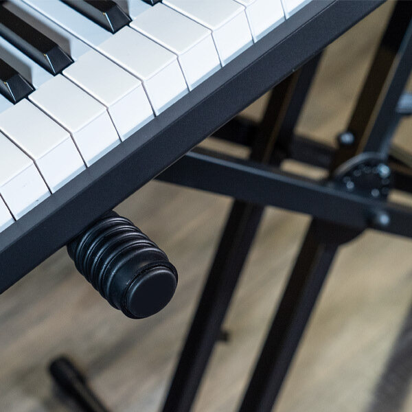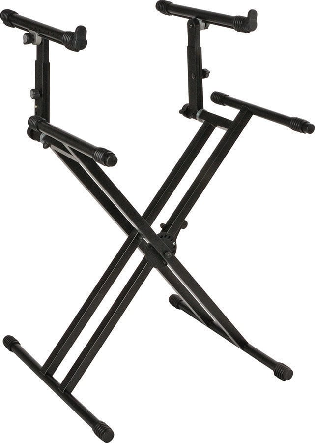 Професійний стенд для клавіатури з додатковою полицею для меншої клавіатури. Конструкція стенду виготовлена зі сталі та має посилену подвійну раму у формі літери X, що забезпечує відмінну стабільність та легку регуляцію.