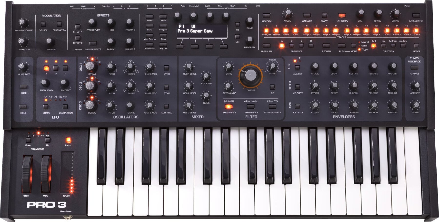 Pro 3 пропонує три осцилятори, три вінтажні фільтри, три LFO, чотири циклічні обвідні, масивну 32-слотову матрицю модів та секвенсор 16 x 16 x 4. Додайте два цифрові ефекти та чотири входи/виходи керуючого напруги, і ви отримаєте надзвичайно потужний інструмент, який так само захоплюючий для програмування, як і для гри.