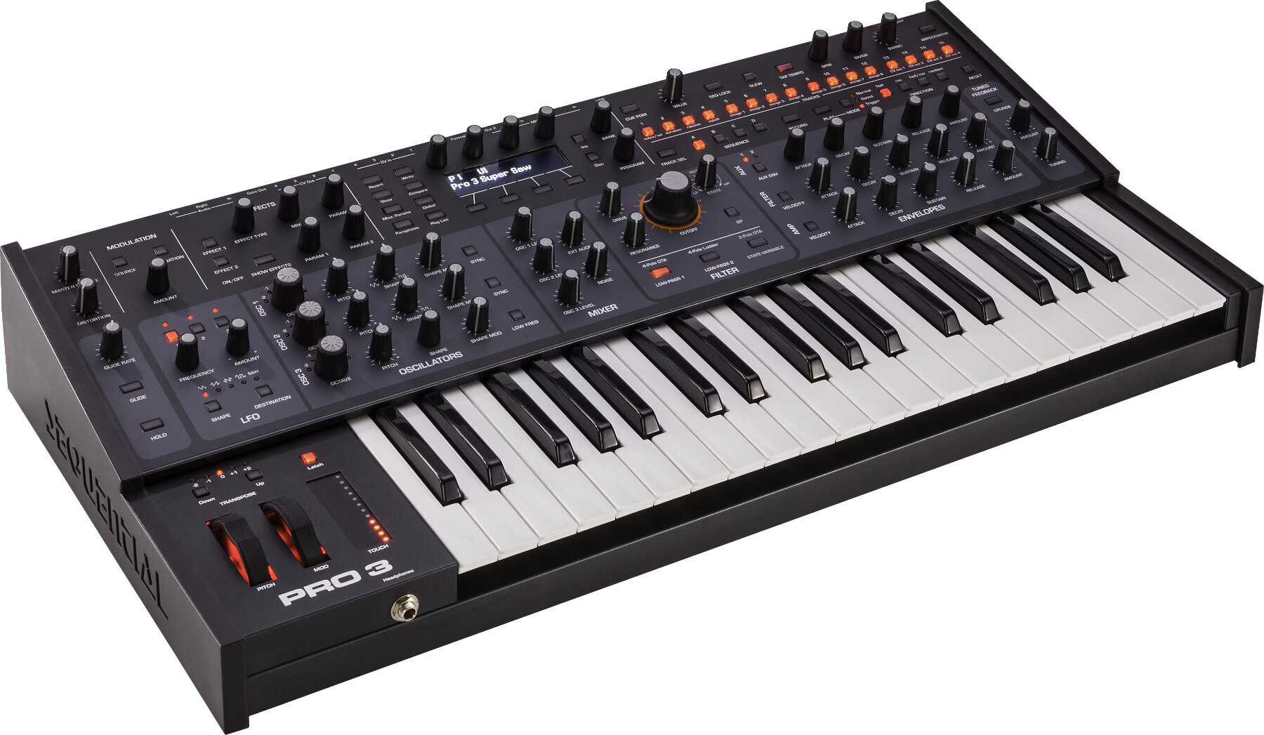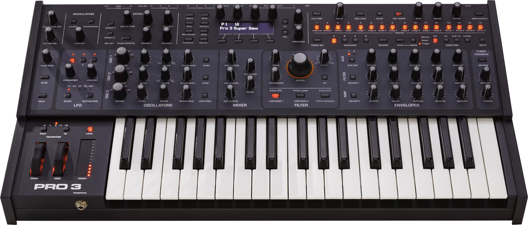 Напевно, найпотужнішим інструментом продуктивності Pro 3 є його секвенсор. З 16 доріжками, 16 кроками та 4 фразами, він пропонує як реальний, так і кроковий ввід, запобіжник, змінну довжину затвору та секвенції, безліч режимів відтворення та парафонічну роботу. Він також синхронізується з MIDI-годинником і зовнішнім аудіовходом, а також з керуючими напругами входів/виходів. Окрім нот, доріжки секвенції можуть керувати будь-яким параметром у матриці модуляції з 171 ціллю.