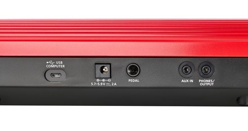 - Число клавіш: 61 клавіша (з покриттям під слонову кістку, за формою і розміром повторюють фортепіанні, відповідають на швидкість натискання)