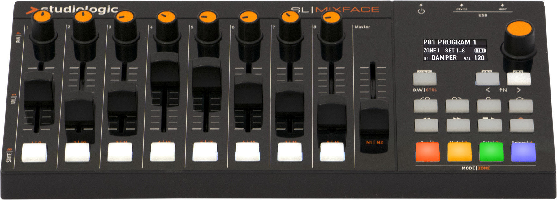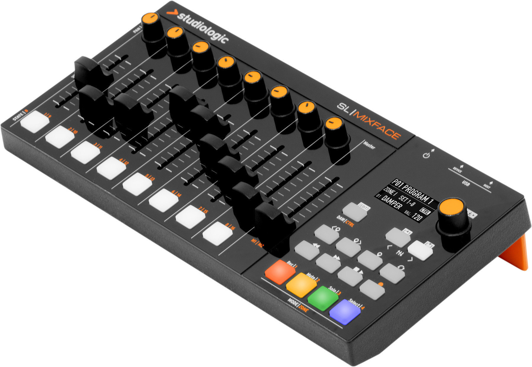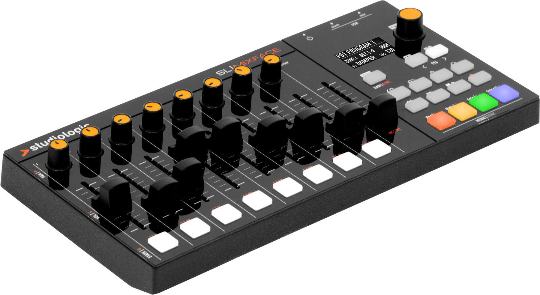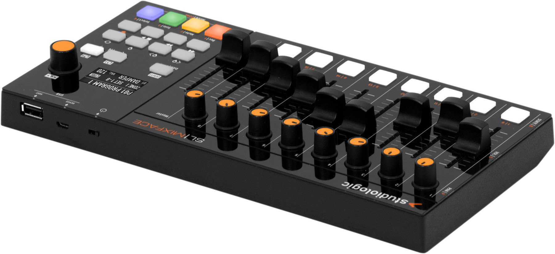 SL MIXFACE ідеально підходить до лінійки контролерів SL, розширюючи їх можливості управління. Дисплей OLED 128 x 64 пікселі, навігаційний кодувальник, 8 ручок, 9 слайдерів, 8 кнопок.