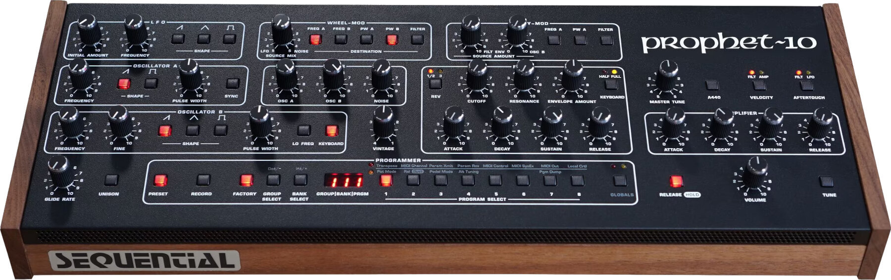 Модуль Prophet-10 вміщує десять голосів легендарного аналогового синтезатора Sequential на вашому столі. Як і версія з повною клавіатурою, він є «найкращим з усіх Prophet-5», оскільки містить усі три версії Prophet-5 — Rev1, Rev2 та Rev3 — завдяки використанню оригінальних аналогових VCO та фільтрів Curtisa (як у Rev3), а також нових нижньочастотних фільтрів 2140, спроектованих Девом Россумом, подібно до фільтрів 2040, які він спроектував в оригінальних Rev1 і Rev2. Перемикач Rev дозволяє вибрати між двома проектами фільтрів. Він також налаштовує форму та реакцію обгортки фільтра, щоб відповідати оригінальному Prophet Rev 1/2 або Rev 3. Результатом є така чиста відновлення аналогового класика, як тільки можна собі побажати, з автентичним, мускулистим звучанням оригіналу та придатністю до руху найсучаснішого сучасного інструмента.