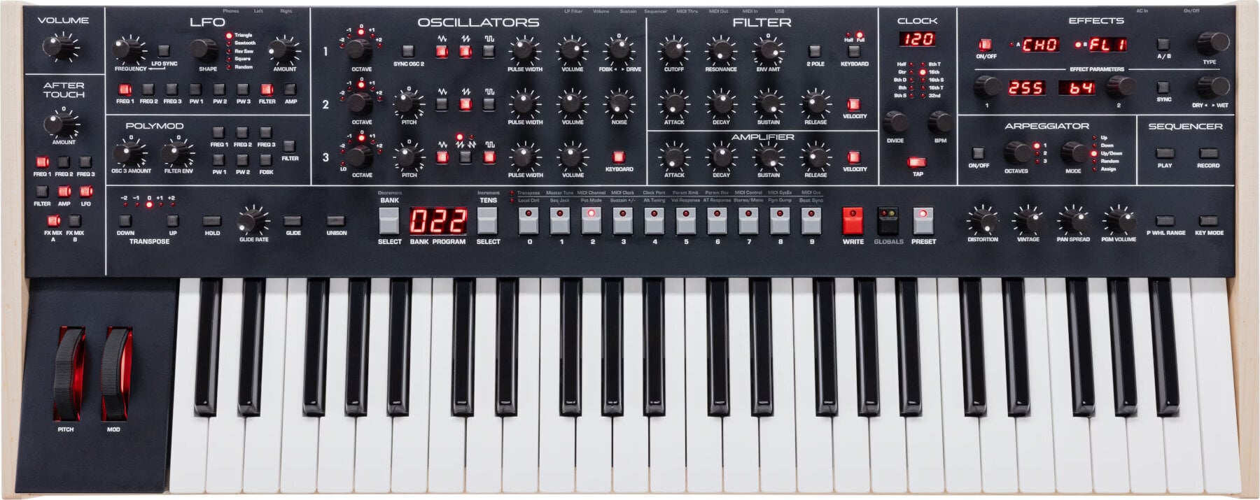 Синтезатор має вдосконалений драбинковий фільтр з перемикаємим резонансним дизайном 2/4 полюса, а також з окремим керуванням драйвом і зворотним зв’язком для додаткової універсальності звучання.