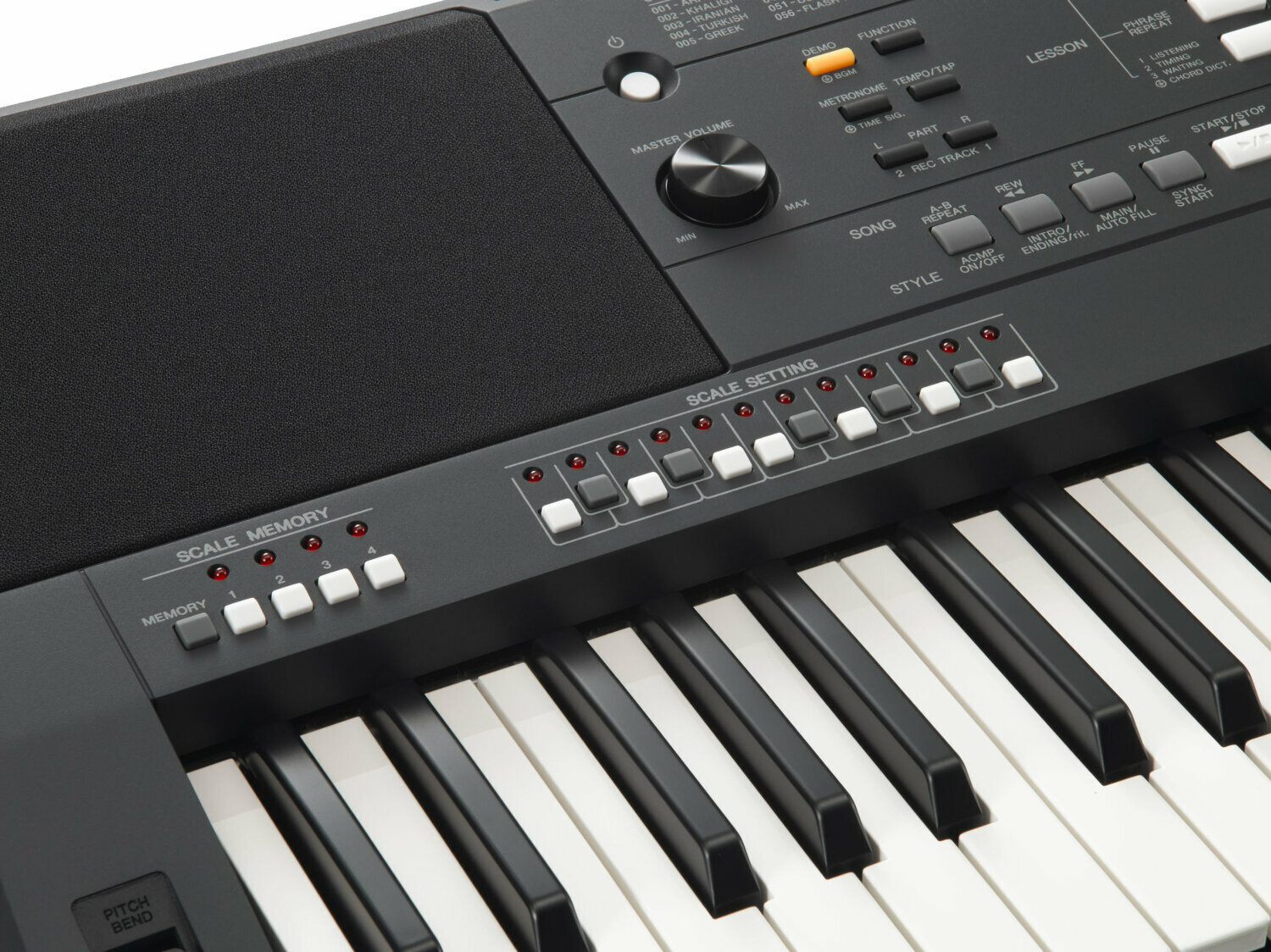 Регулятор pitch bend дозволяє контролювати висоту звуку в реальному часі, надаючи грі реалістичний вигляд. Ви можете підключити клавіатуру до комп’ютера через USB to Host та передавати дані. 10 нестандартних баз даних стилів дозволяє зберігати та використовувати зовнішні стилі.